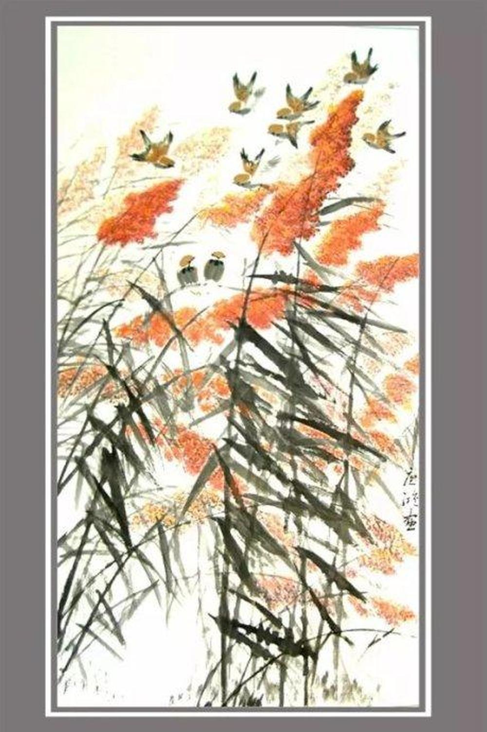 画家廖庚鸿《年年红》作品,描写了红高粱火红的丰收景象,画面有多只麻雀飞来,更加增添了丰收喜悦之景。